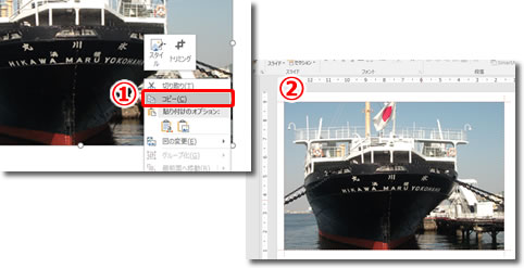 写真を選択した状態で右クリックし、(1)コピーします。(CTRL+Cでも可)次に2ペースト(CTRL+V)し、2枚の写真を上下中央ずれずに揃えます。