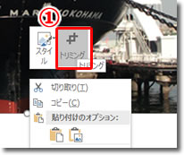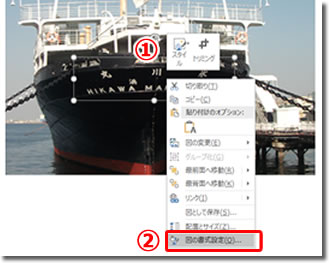 トリミングした写真部分を選択した状態で、右クリックでメニューを表示させ、(1)図の書式設定を選択します。