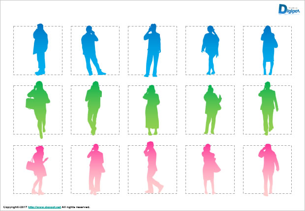 シルエットのパワーポイントのパーツは拡大や縮小、色の変更などが可能です。背景や遠近に合わせて配置することで、誰もいない空間を賑やかにすることもできます。