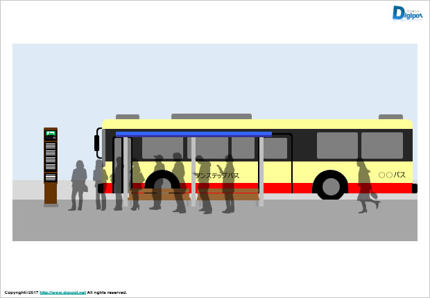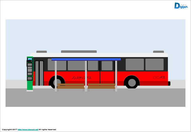 フリー、無料で使えるバス停の背景イメージイラスト画像です。パワーポイントの図形機能で作成しています。人が並んでいるパターンと並んでいないパターンです。配色は自由に変更してください。