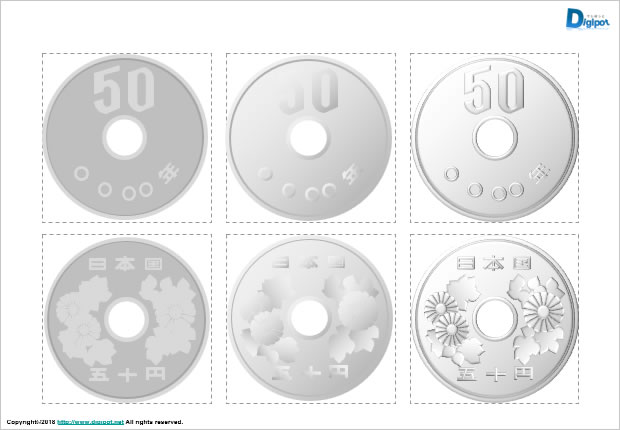 フリー、無料で使える五十円玉のイラスト画像です。パワーポイントPPTX形式、PNG形式画像で作成しています。制作は主に図形機能を使っています。ふちアリとふちなしの2パターン作成しています。