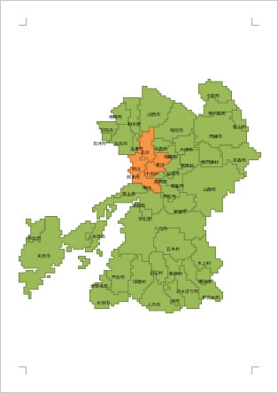 市区町村を境にした熊本県地図全体。市町村名入り。通常タイプ、通常白黒タイプ、グリッドタイプ、グリッド大きめタイプの計4パターンを用意しています。