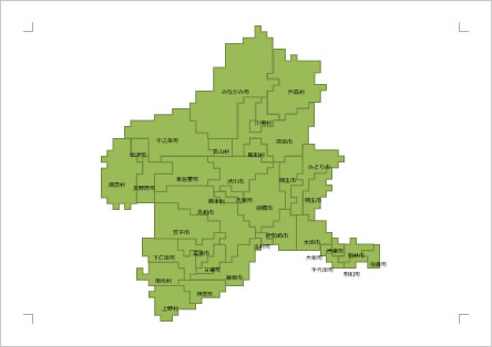 市区町村を境にした群馬県地図全体。市町村名入り。通常タイプ、通常白黒タイプ、グリッドタイプ、グリッド大きめタイプの計4パターンを用意しています。