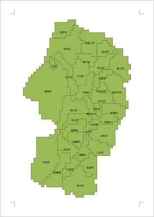 市区町村を境にした山形県地図全体。市町村名入り。通常タイプ、通常白黒タイプ、グリッドタイプ、グリッド大きめタイプの計4パターンを用意しています。