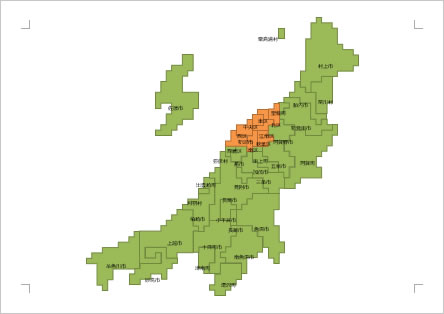 新潟県の市区町村をエリア分けした地図です。資料作成などにご活用ください。パワーポイントから出力したものですが、パーツ分けされているので、文字の編集などができます。