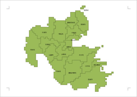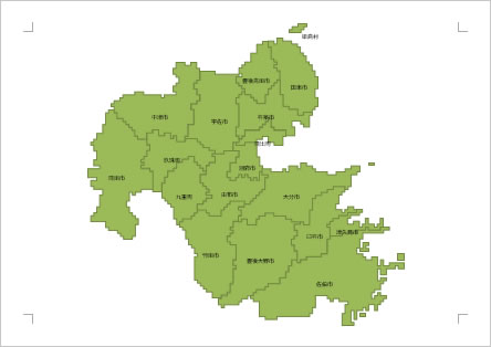 大分県の市区町村をエリア分けした地図です。資料作成などにご活用ください。パワーポイントから出力したものですが、パーツ分けされているので、文字の編集などができます。