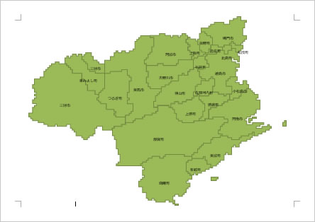市区町村を境にした徳島県地図全体。市町村名入り。通常タイプ、通常白黒タイプ、グリッドタイプ、グリッド大きめタイプの計4パターンを用意しています。