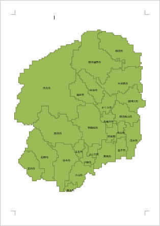 市区町村を境にした栃木県地図全体。市町村名入り。通常タイプ、通常白黒タイプ、グリッドタイプ、グリッド大きめタイプの計4パターンを用意しています。