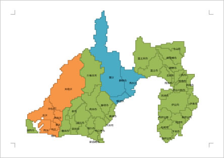 静岡県の市区町村をエリア分けした地図です。資料作成などにご活用ください。パワーポイントから出力したものですが、パーツ分けされているので、文字の編集などができます。