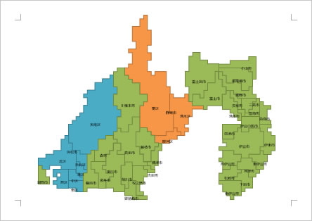 市区町村を境にした静岡県地図全体。市町村名入り。通常タイプ、通常白黒タイプ、グリッドタイプ、グリッド大きめタイプの計4パターンを用意しています。