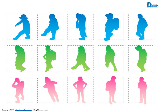 上から、上方気味から見たアングルの人物各種。上から見下ろしたアングル、腰に手を当てている人、手を差し伸べる人、歩いている男性や女性、立っている男性や女性、リュックを背負っている人物、白黒タイプ、グラデーションタイプなどイラスト30種類。