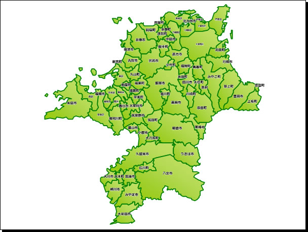 市区町村を境にした福岡県地図。通常タイプ、グリッドタイプ(大中小)のそれぞれ通常、立体タイプの計8パターンを用意しています。