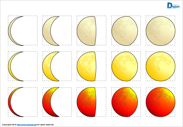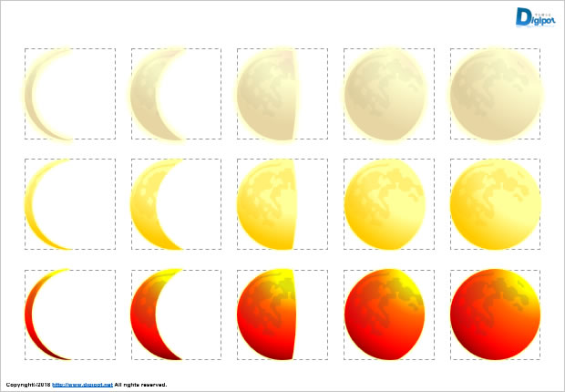 月のイラスト、スーパームーン、月の満ち欠け、三日月、満月、白い月、黄色い月、赤い月など