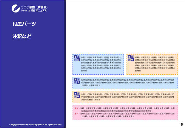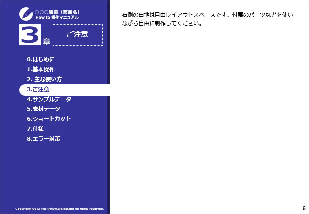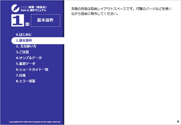 A4横型のマニュアルテンプレート、目次、説明エリア、記入レイアウトサンプル、パーツ素材などA4横型10ページ。