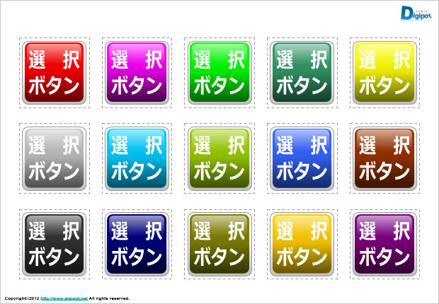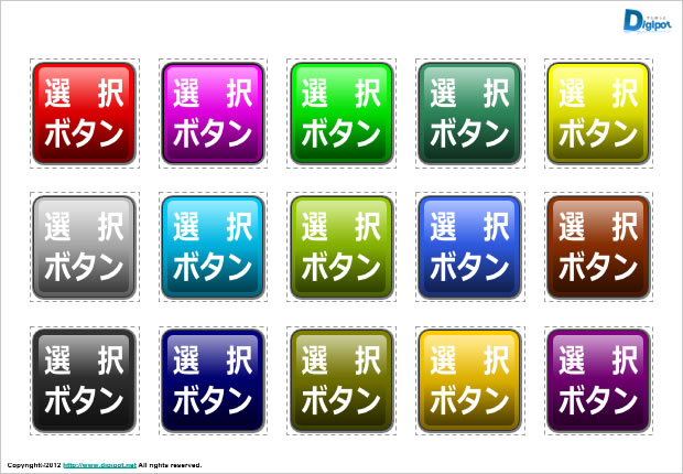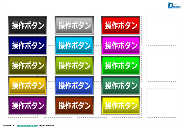 カラフルなボタン、透明感のあるボタン、丸形ボタン、角丸長方形ボタン、角丸正方形ボタンなど8種類と各カラーバリエーション