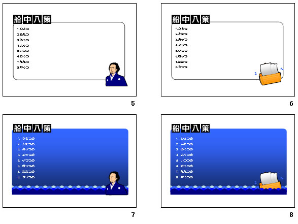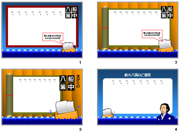 近頃良く取りあげられる船中八策という単語。なかなか陰謀めいた印象も受けますが、ご存知坂本龍馬が幕末に練り上げた新国家の基本方針だ。二番煎じと笑うことなかれ、時流に乗ることは大切な事だ。きっと会社方針や提案などに使えば、より印象深いものになるはずです。