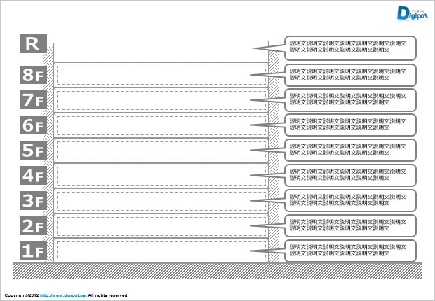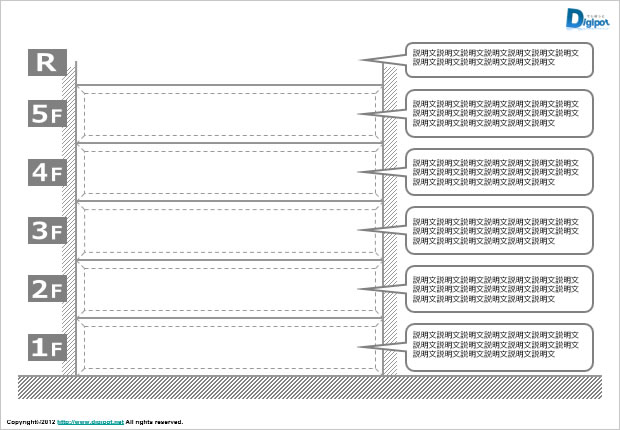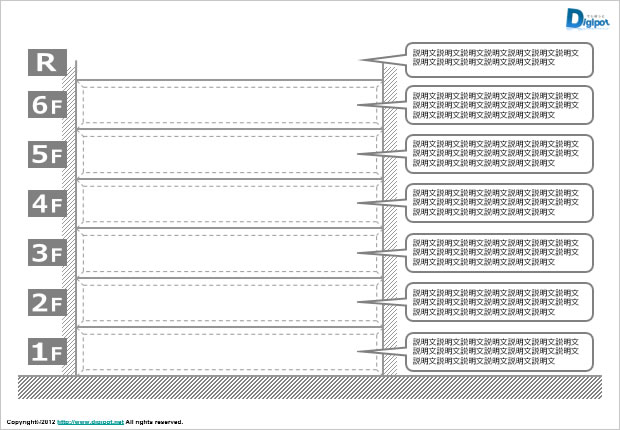 フリー、無料で使えるフロア図のテンプレート/横から視点画像です。パワーポイントPPTX形式で作成しています。制作は主に図形機能を使っています。フチ有りとフチ無しの2パターン作成しています。
