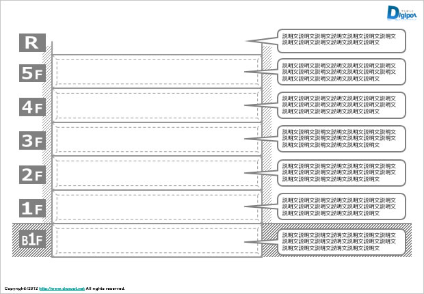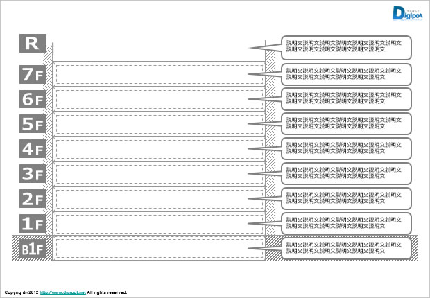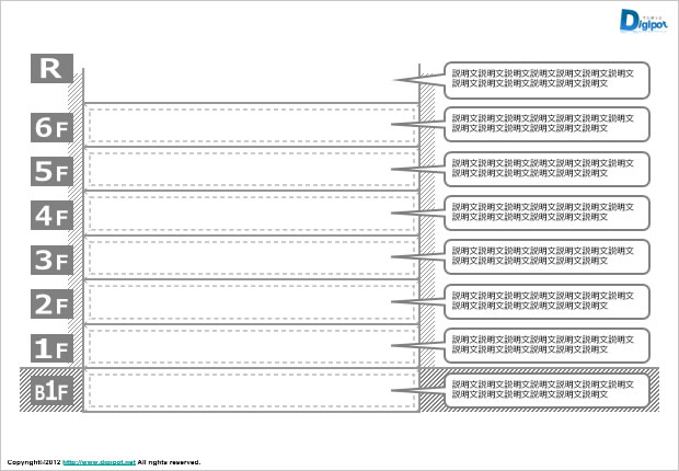 横から見た断面的なフロア図テンプレートです。建物の各階を層として横に並べて示す方式で、各フロアの高さ関係や設備の縦配管、段差、スロープの位置、機器の高さ関係を説明するのに向いています。オフィスや店舗のゾーニング提案、バリアフリー対策、設備設置計画、内装工事の仕様確認などで使いやすく、図の右側には各フロアの注釈や吹き出しで補足説明を記載できるスペースを確保しています。PowerPointで手早く編集できるため、施工前後の比較やプレゼン資料作成にも便利です。