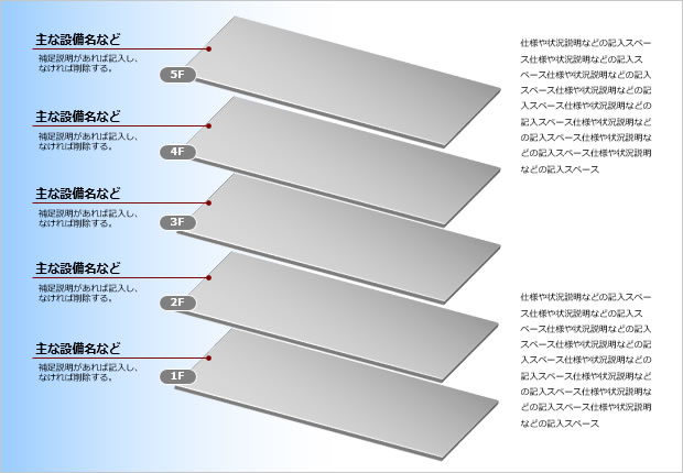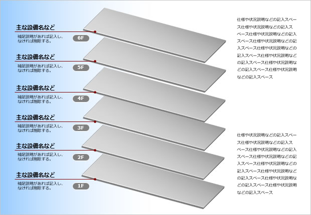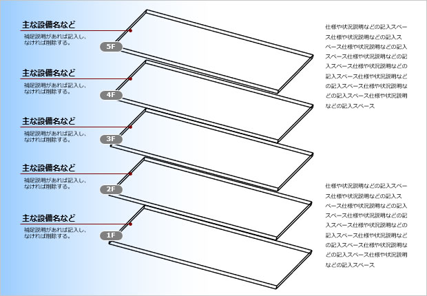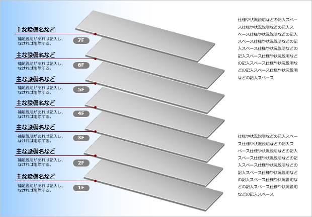 建物やフロアをやや斜め上から見下ろす視点で描写するため、部屋や設備、机や什器の配置、導線が立体的に分かりやすく表現できます。各フロアの機器設置位置や部門レイアウト、来客導線、避難経路やゾーニング提案などの資料に適しており、右側にフロアごとの説明欄を設けてコメントや詳細を追記できる設計です。プレゼン用に見栄えの良いビジュアルを保ちながら、編集はPowerPointで容易に行えるよう最適化しているため、内覧資料や改修提案、イベント会場の配置検討にも活用できます。