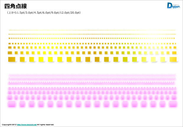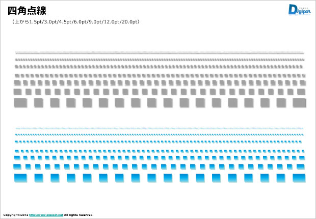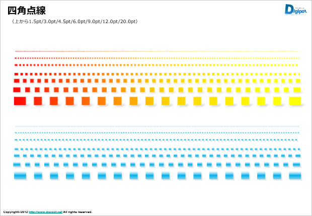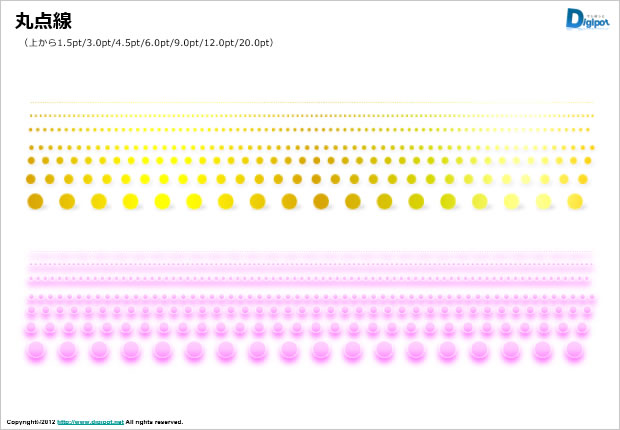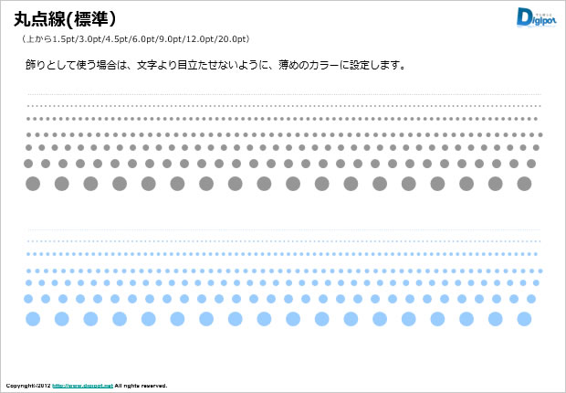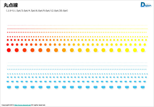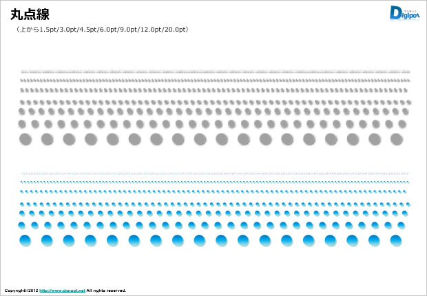 図形機能で作成した点線、ドットラインオブジェクトの太さ別、効果別のサンプルです。そのままコピーして使う事もできますし、書式コピーで使う事もできます。