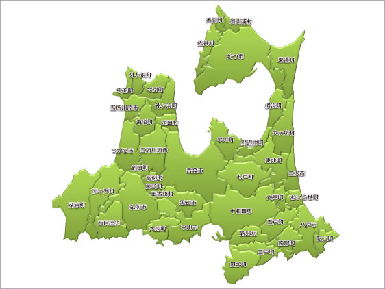 市区町村を境にした青森県地図。立体イメージ(パワーポイントのエフェクト使用)、通常タイプ、通常白黒タイプ、グリッドタイプ(小、中、大)と、通常、白黒、グリッドを縮小したタイプの計9パターンを用意しています。