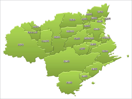 市区町村を境にした徳島県地図。立体イメージ(パワーポイントのエフェクト使用)、通常タイプ、通常白黒タイプ、グリッドタイプ(小、中、大)と、通常、白黒、グリッドを縮小したタイプの計9パターンを用意しています。