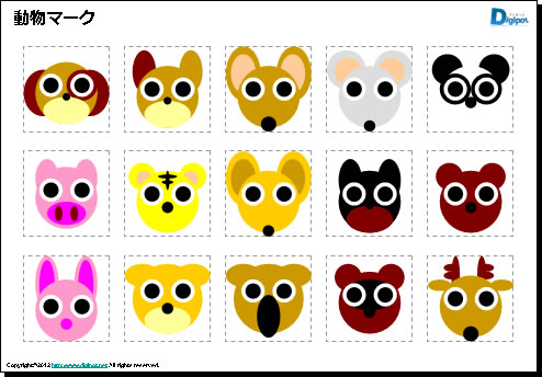 シンプルな動物マーク、普通顔とニコニコ顔、犬、ネコ、ブタ、パンダ、トラなど