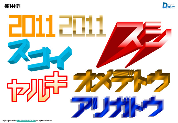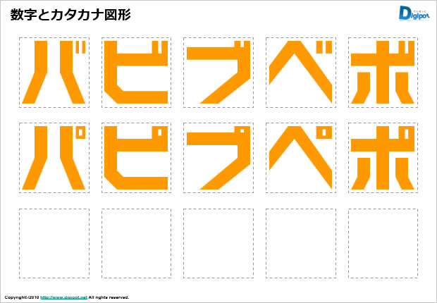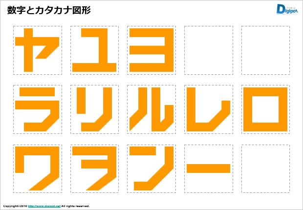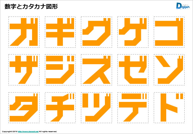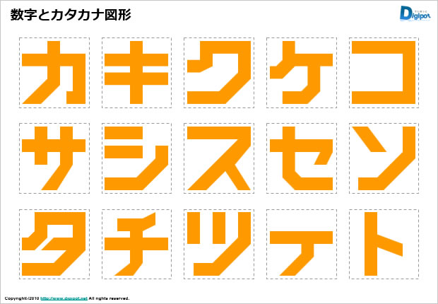 カクカクした形状のカタカナと数字です。図形っぽく面白い表現が可能と思います。着色や3D化などでうまくご利用ください。