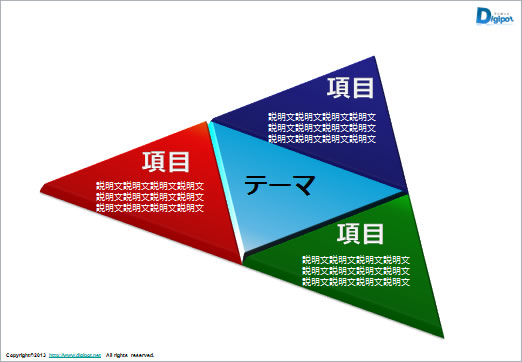 フリー、無料で使えるトライアングル図作成テンプレートです。説明図の作成などにご利用ください。