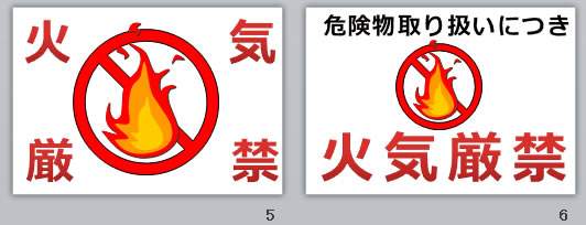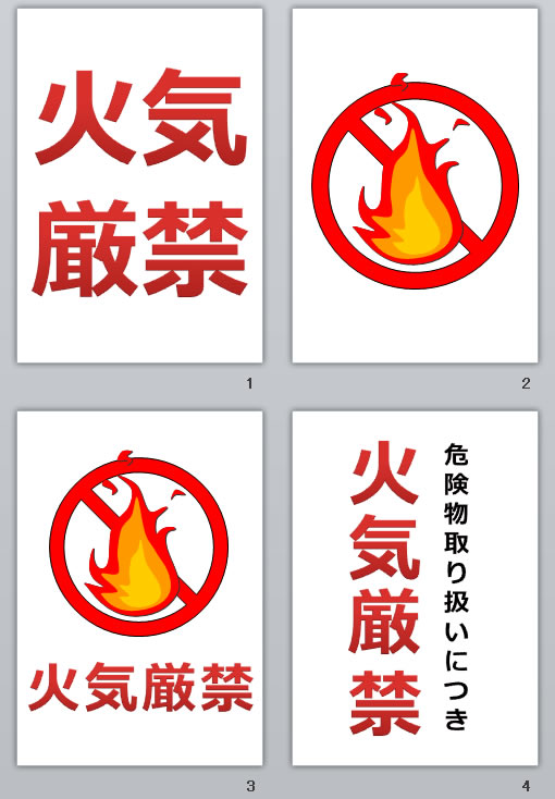 「火気厳禁」の文字のみ、「火気厳禁」とアイコン表示などA4縦/横