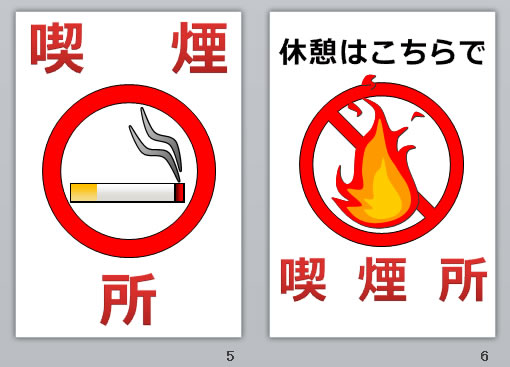 「喫煙所」の文字のみ、「喫煙所」とアイコン表示などA4縦/横