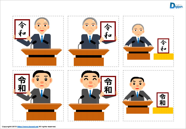 令和の額を持つ人、新年号発表のイラスト、令和の記者会見の様子のイラスト、フチ有りフチ無しなど12パターン。
