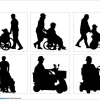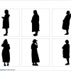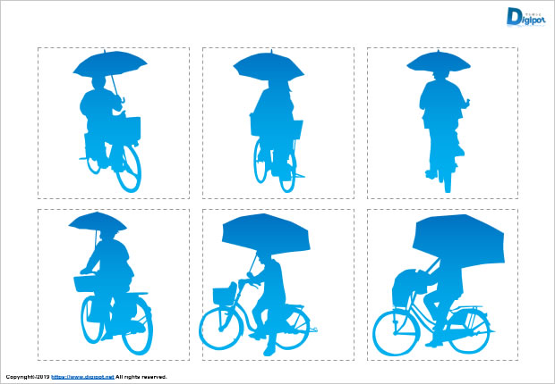 傘を差しながらの自転車運転シルエット、傘さし運転、傘を持って運転、斜めアングル、横からのアングル、白黒、グラデーションなど12パターン