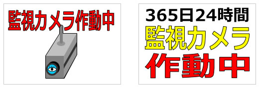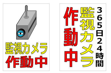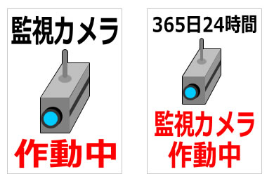 「監視カメラ作動中」「365日24時間監視カメラ作動中」などの文字とイラスト、A4サイズ縦横など各種12パターン。