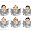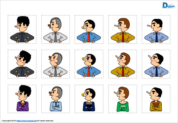 ハナを高くする男性のイラスト、ハナタカのイラスト、得意気な表情、自慢、鼻高々、フチ有りフチ無しなど30種類