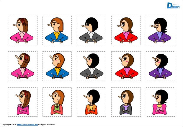 フリー、無料で使えるハナを高くする人のイラスト画像です。パワーポイントPPTX形式、PNG形式画像で作成しています。制作は主に図形機能を使っています。フチ有りとフチ無しの2パターン作成しています。