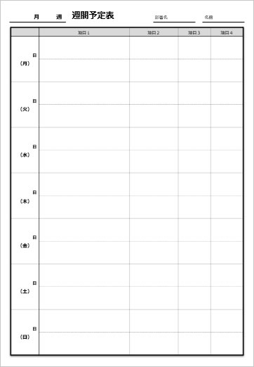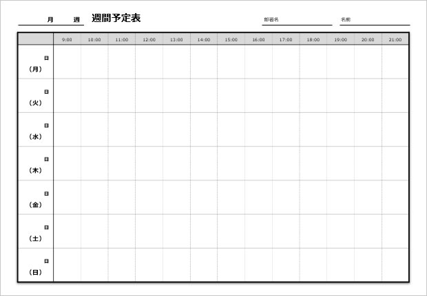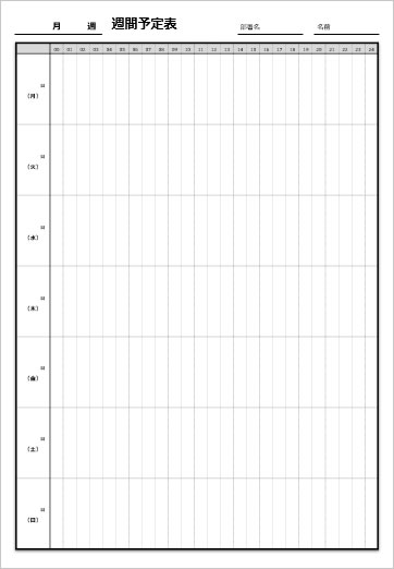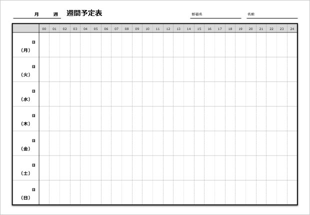 月~日曜日までの一週間スケジュール表テンプレート、12時間用、24時間用、各種項目用、土日幅縮小タイプ、横置きタイプ、縦置きタイプなど