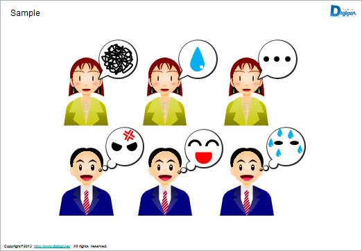 フリー、無料で使える吹き出しで表情づくりをするためのパーツです。同じキャラクターでも、吹き出しパーツを使う事で、同じイラストでもいろんな表現に置き換えることができます。または、そのまま吹き出しとしてご利用ください。
