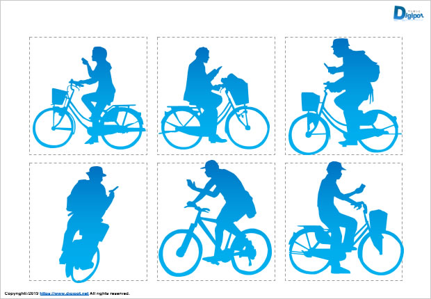 スマホを見ながら自転車に乗る人のシルエット、自転車の危険運転、わき見運転、白黒、グラデーションなど12パターン