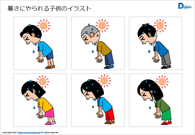 暑さにやられる子供のイラスト、男の子、女の子、熱中症気味の子供、フチ有りフチ無しなど12種類