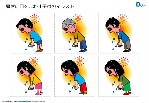 暑さに目をまわす子供のイラスト、男の子、女の子、熱中症気味の子供、フチ有りフチ無しなど12種類