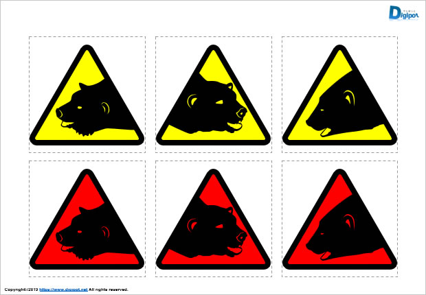 熊注意、熊出没注意マークのイラスト、三角形のマーク、丸のマークなど12種類