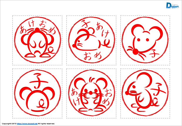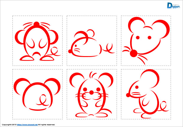 筆書き風のネズミのイラスト、ネズミのハンコ、子年、ハンコ風、白黒、朱色など24種類。