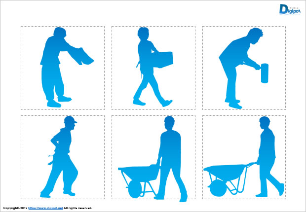 工事作業員のシルエット、一輪車、工事作業、白黒、グラデーションなど12種類