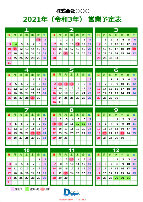 2021年用の営業日を案内するためのカレンダーテンプレートです。会社やお店の休業、休店日などを追記するなどしてご活用ください。