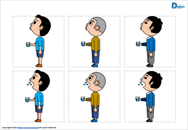 うがいする男の子イラスト、口をゆすぐ、小学生、子供、風邪予防、フチ有りフチ無しなど12種類