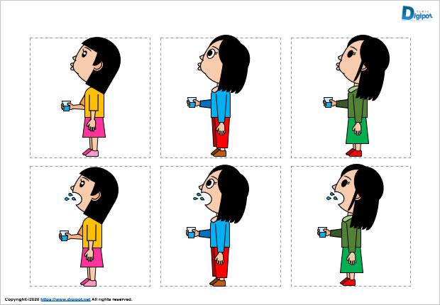 うがいする女の子イラスト、うがいする子供、口をゆすぐ、小学生、子供、風邪予防、フチ有りフチ無しなど12種類