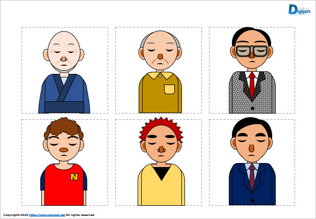 目を閉じる男性のイラスト、黙祷、お年寄り、おじいさん、会社員、サラリーマン、フチ有りフチ無しなど12種類。