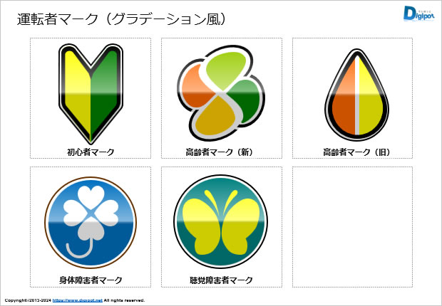 初心者マーク、高齢者マーク(新)、高齢者マーク(旧)、聴覚障害者マーク、聴覚障害者マーク、グラデーションタイプなど10種類