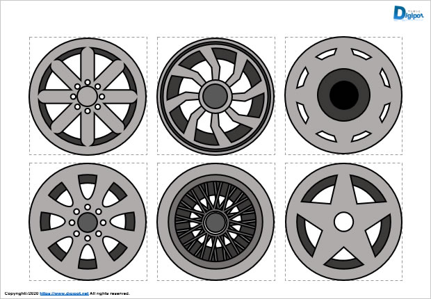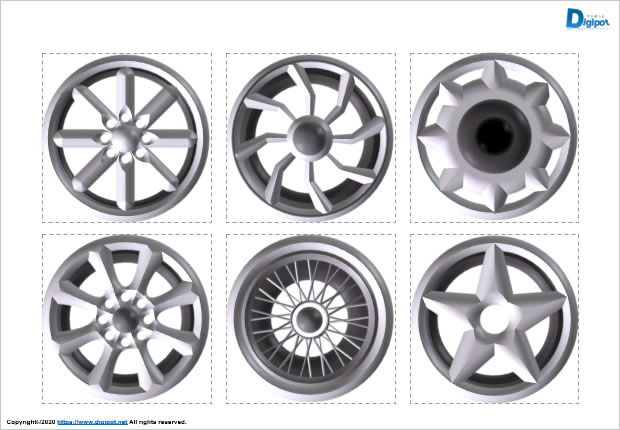 タイヤホイール型図形、平面タイプ、立体タイプ、フチ有りフチ無しなど18種類